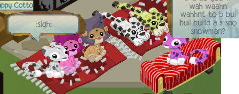 That's out family photo. Up there, the 2 lions are my mom and my dad, Wilburt and Tristine. I'm the white snow leopard, beside me is my sister. Carla. She's 5 minutes younger than me. Those 2 cheetahs down below is our Grandpa and Grandma. The white one is Grandpa Stan, while the yellow one is Grandma Wendy. So, that's my family! Here's a little bit about me, I love books, and music too! Here is my room.